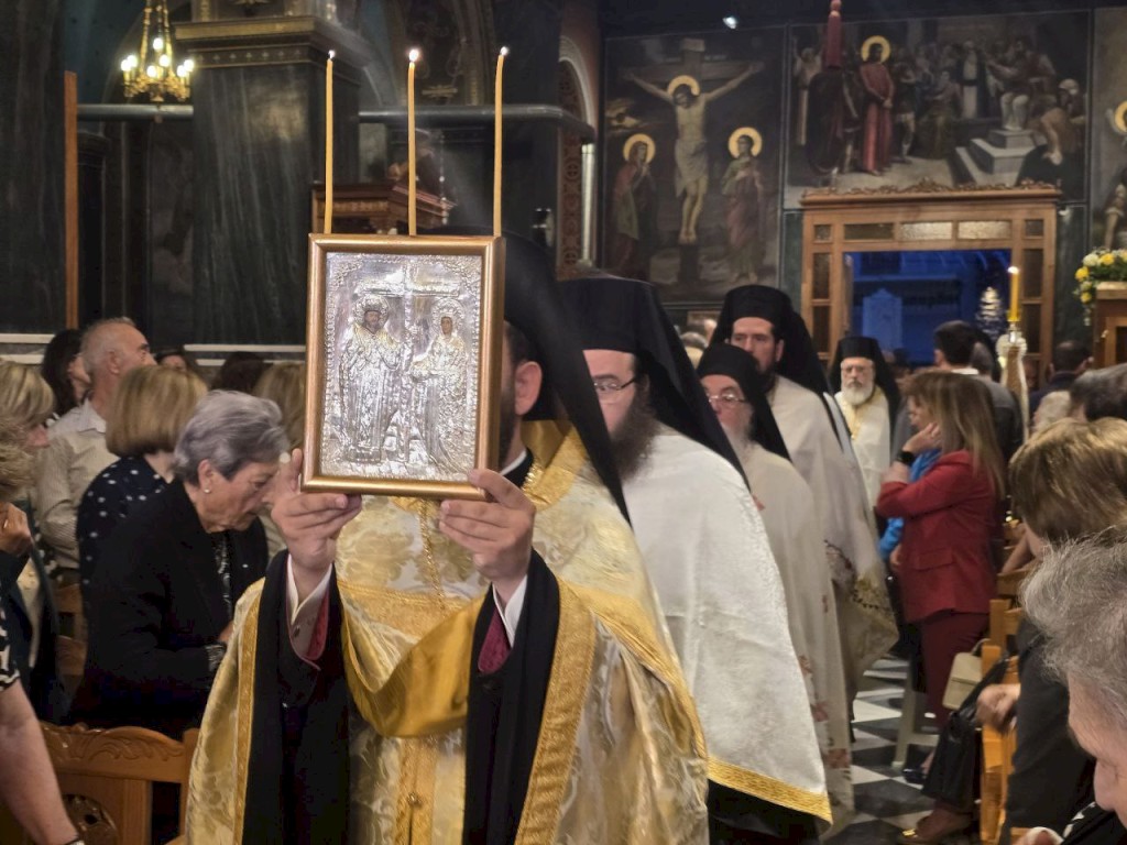 Ιδιαίτερη λαμπρότητα είχε η παραμονή της εορτής, Τρίτη 20 Μαΐου, κατά την οποία τελέστηκε Πανηγυρικός Αρχιερατικός Μέγας Εσπερινός στον Ιερό Ναό Αγίων Κωνσταντίνου και Ελένης, προεξάρχοντος του Σεβασμιωτάτου Μητροπολίτου Μεγάρων και Σαλαμίνος κ.κ. Κωνσταντίνου.