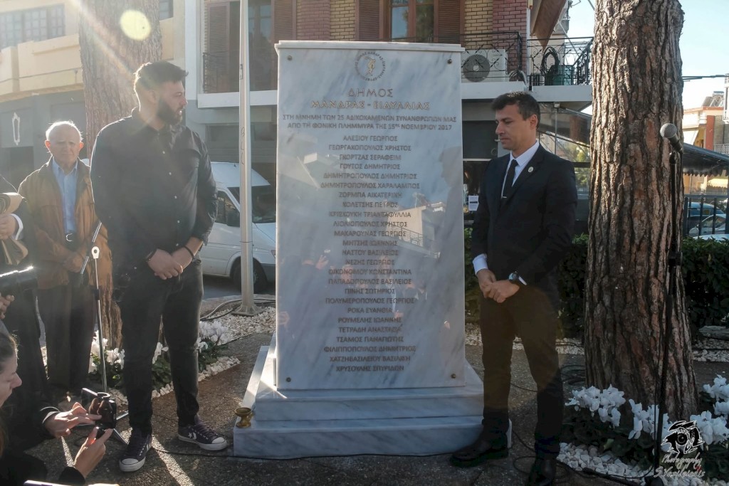 «Στεκόμαστε σήμερα όλοι μαζί σε μια βαριά και βαθιά ανθρώπινη στιγμή. Σε μια στιγμή όπου η πόλη μας δεν τελεί απλώς μια τελετή, αλλά καταθέτει δημόσια τη συνείδησή της. Σήμερα, η Μάνδρα σκύβει ευλαβικά μπροστά στη μνήμη των ανθρώπων που χάθηκαν τραγικά και άδικα, στις 15 Νοεμβρίου 2017, υπό τη μανία της κακοκαιρίας «Ευρυδίκη». Το μνημείο που αποκαλύπτεται σήμερα δεν είναι απλώς μια δημιουργία στον δημόσιο χώρο.