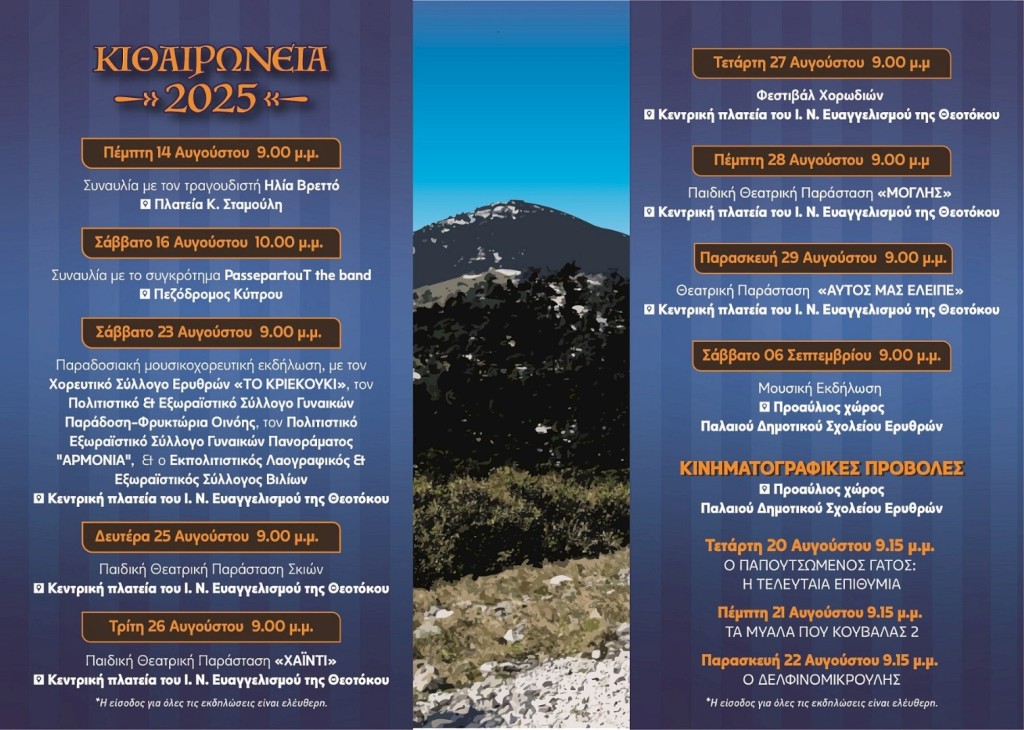 Ο Δήμος Μάνδρας-Ειδυλλίας έχει την χαρά να σας προσκαλέσει στις πολιτιστικές εκδηλώσεις "ΚΙΘΑΙΡΩΝΕΙΑ 2025" που θα πραγματοποιούνται από 14 Αυγούστου έως 6 Σεπτεμβρίου στη ΔΕ Ερυθρών.