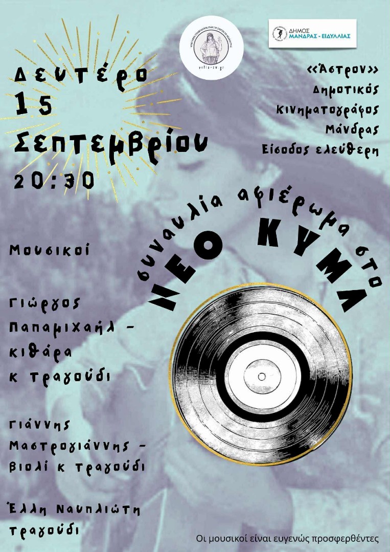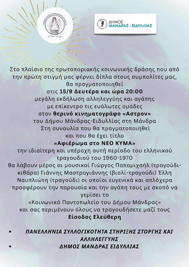 Ο Δήμος Μάνδρας – Ειδυλλίας σε συνεργασία με την Πανελλήνια Συλλογικότητα Στήριξης, Στοργής και Αλληλεγγύης διοργανώνουν τη Δευτέρα 15 Σεπτεμβρίου 2025, στις 20:00, στον Θερινό Κινηματογράφο «Άστρον» στη Μάνδρα, μια μεγάλη συναυλία κοινωνικής αλληλεγγύης με τίτλο: «Αφιέρωμα στο Νέο Κύμα»