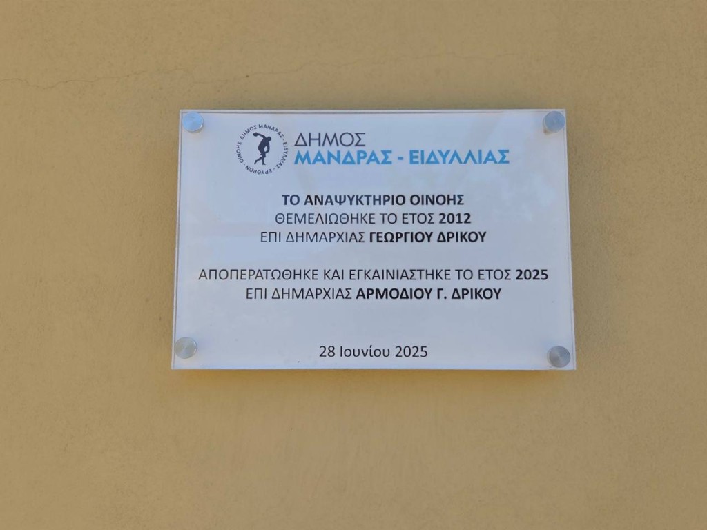 Το Σάββατο 28 Ιουνίου, σε ατμόσφαιρα ιδιαίτερης συγκίνησης και με τη συμμετοχή πλήθους δημοτών, πραγματοποιήθηκαν τα εγκαίνια του νέου Δημοτικού Αναψυκτηρίου στην Οινόη από τη Δημοτική Αρχή Μάνδρας-Ειδυλλίας. Παρόντες στην εκδήλωση ήταν εκπρόσωποι της Τοπικής Αυτοδιοίκησης, τοπικοί σύμβουλοι και φίλοι της περιοχής.
